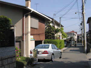 そこを右折(南下)して50m南下すると当院があります。ガレージ前のセットバック・スペースに幅寄せして横付け駐車して下さい。(下の右の写真)