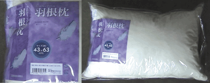 枕;ホームセンター・コーナン販売の中国製の羽根枕(KHD06-8534 980円 43cm×63cm)もお勧めしています。(2006年7月に新しい商品に変わり798円から980円になりました。)