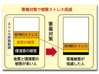 頭蓋骨矯正だけでなく食害被害や環境害被害を低減する害毒対策を併用すれば、脳のストレス許容範囲が本来の広さに回復するので、健康度が向上するこをも図は示しています。