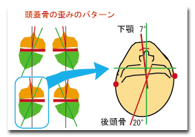 左の図は後頭部と顔面部の回旋歪みがそれぞれ左や右に向いた4通りのパターンを示し、その中から後頭部が約20°右を向いており、顎は左に約7°向いてしまっている歪みの例を紹介しています。一番多いパターンは顎・後頭部共に右向きパターンです。