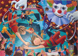 娘が美術学校時代に、私達夫婦に描いてくれた絵が右の絵です。夫婦の在り方を天からの空中ブランコに例えて描いてくれました。私達の宝であり、縮小版を施術室に飾っています。